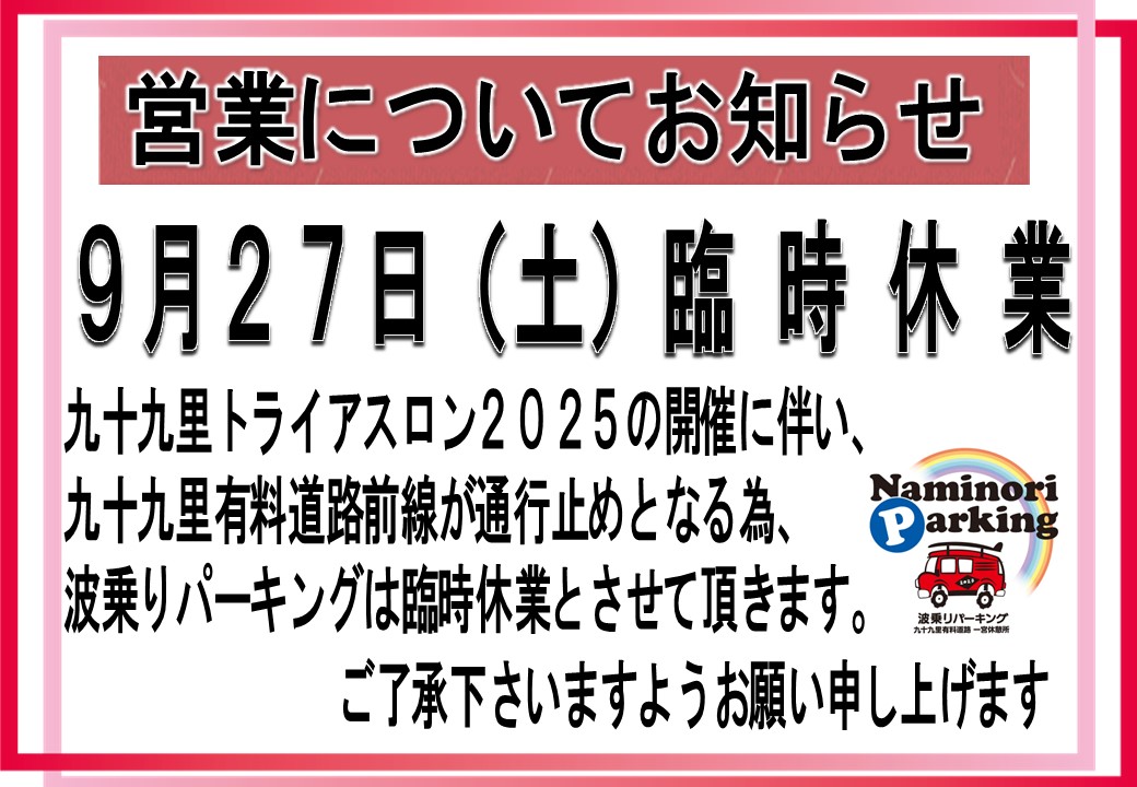 令和7年9月27日(土)は『九十九里トライスロン2025』の開催に伴い九十九里有料道路が全線通行止めとなる為、波乗りパーキングは臨時休業とさせていただきます。ご迷惑をお掛け致しますが、何卒ご了承の程お願いいたします。
